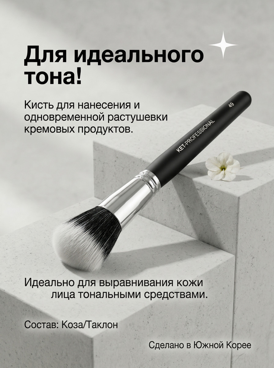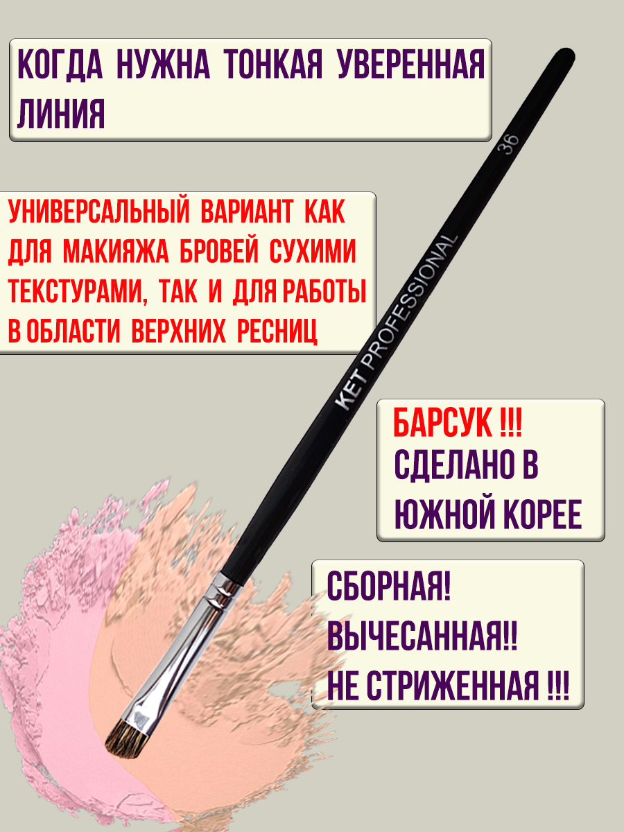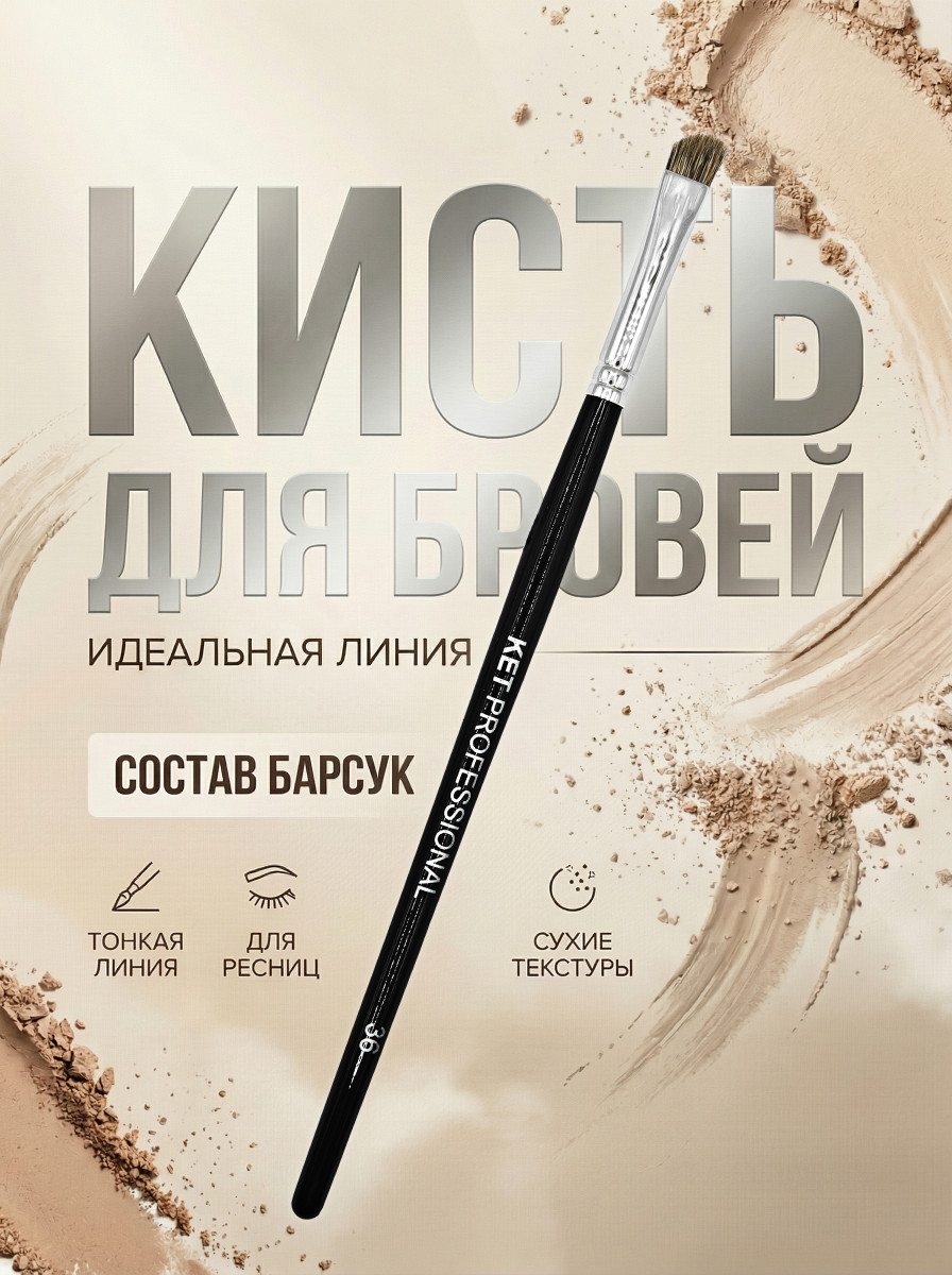 Кисть "KET PROFESSIONAL" (№36 барсук)Кисть для визажа KET PROFESSIONAL — незаменимый инструмент для создания безупречного макияжа. Изготовленная из натурального барсучьего волоса, она обеспечивает ровное нанесение косметических средств. Жесткая, слегка скошенная форма кисти идеальна для прорисовки бровей сухими текстурами, создания четких стрелок и фиксации кремовых теней. Черный цвет кисти придает ей стильный и элегантный вид.